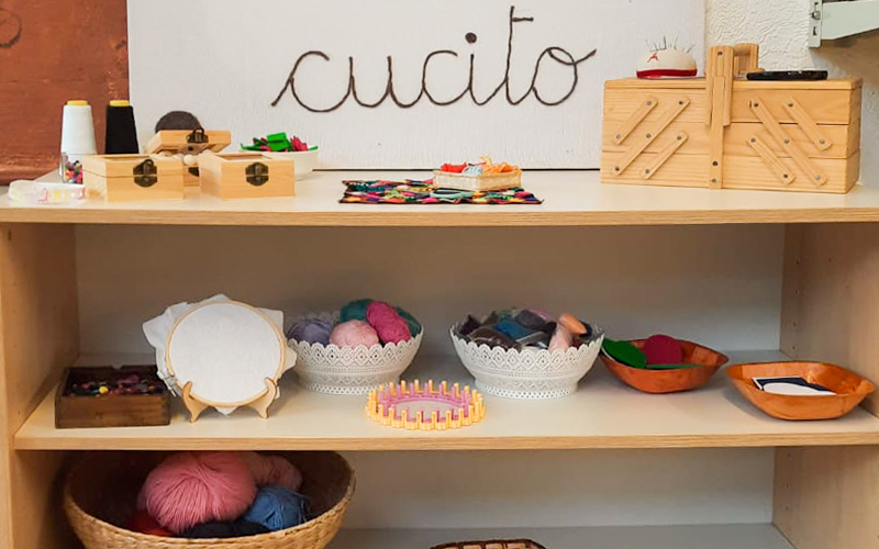 È un angolo curato ed ordinato dove i bambini possono sperimentare varie tecniche, dal cucito vero e proprio al telaio, passando per l’uncinetto. I vantaggi dati da un’attività come questa sono molteplici, infatti oltre ad esercitare la motricità fine, i bambini potranno esprimere la loro creatività e concentrazione portando a termine dei veri e propri pezzi d’arte che fungono da rinforzo positivo.